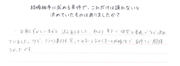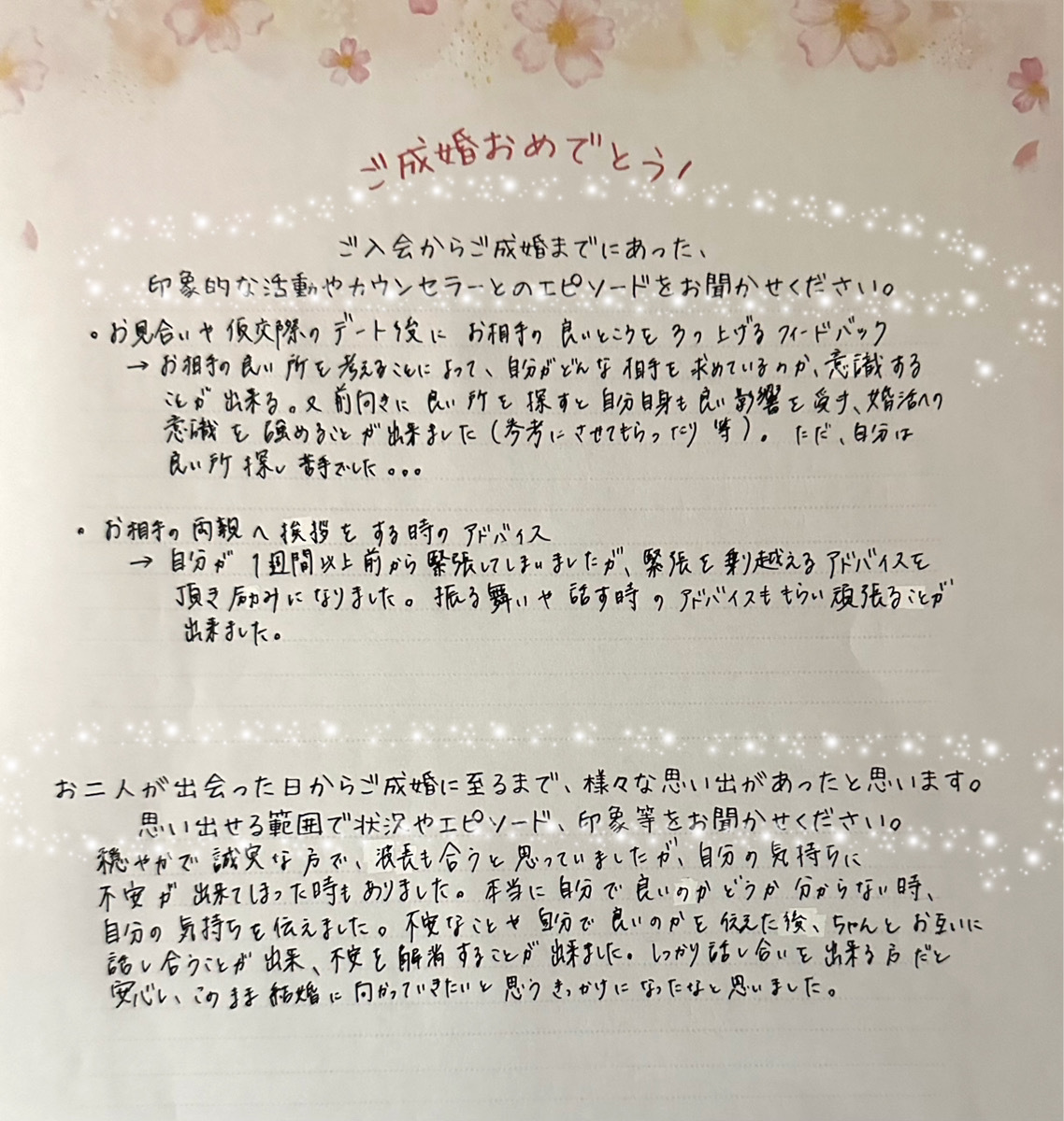 ご成婚インタビューにお書きになっていた通り活動前は色々と条件を仰っておりましたが、とても素敵な女性とのご縁が有り「何があっても一生を共に過ごしたい方」だとお聞かせ頂いた時は私も本当に嬉しかったですよ♪